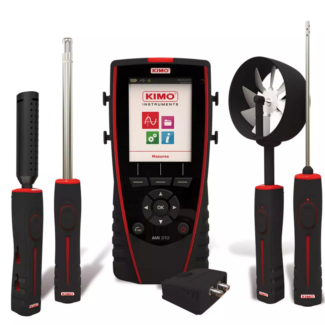 L’AMI 310 Kimo mesure en simultané des paramètres tels que la pression, la température (Pt100 et thermocouple), l’humidité, la qualité d’air (CO/CO2), la vitesse d’air, le débit d’air (sondes à hélice et fil chaud), et la tachymétrie.