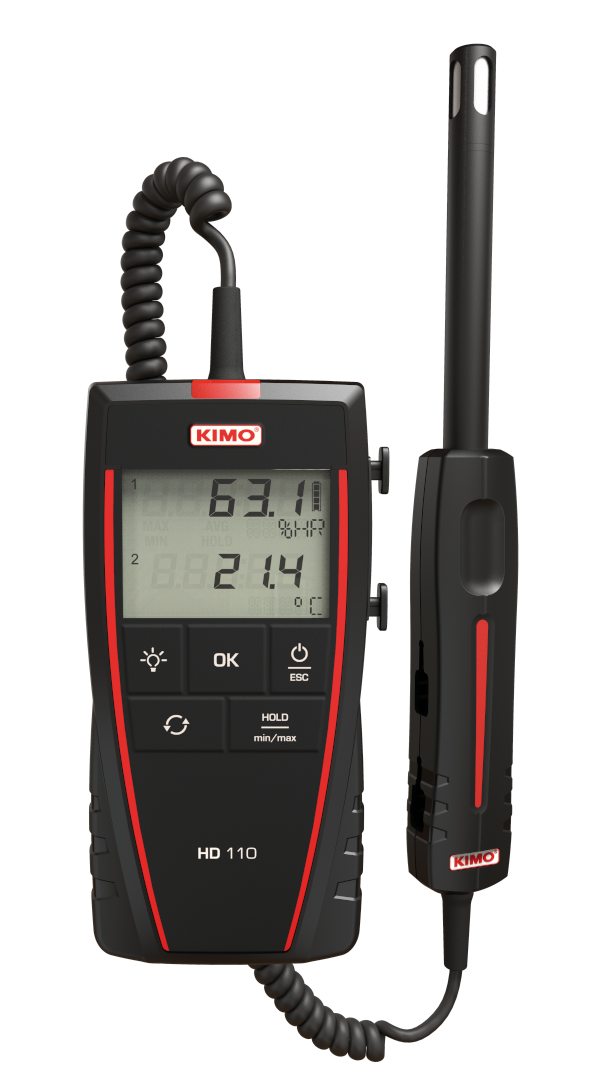 Le thermo-hygromètre portable HD 110 Kimo mesure l’humidité relative, la température et le point de rosée.