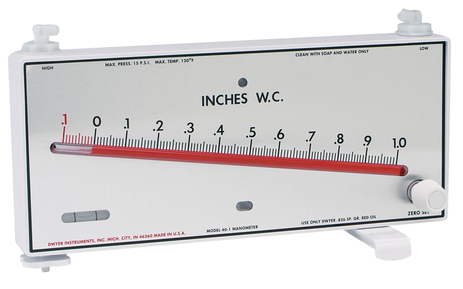 - Le modèle 40 contient deux longueurs de 4-1/2' de tube en plastique transparent, un support pivotant en plastique et une vis de mise à niveau pour un fonctionnement portable. Il comporte également des raccords de pression à fermeture rapide pratiques et des pièges de sécurité intégrés contre la surpression.
