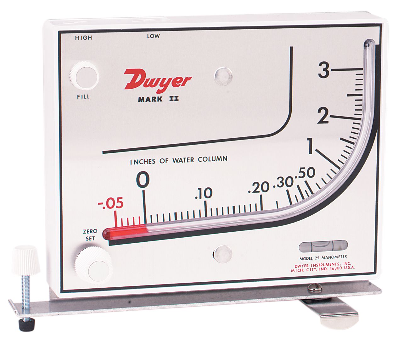 - Inclus avec chaque manomètre Mark II sont deux connecteurs de tube pour tuyau de 1/8" ou conduits en tôle, deux vis de montage, une bouteille de 1 once de liquide indicateur, des drapeaux pointeurs rouges et verts et des instructions complètes.
